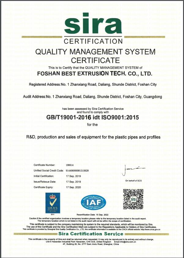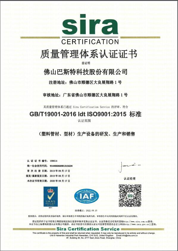 熱烈祝賀佛山巴斯特科技股份有限公司通過(guò)國(guó)家GB/T19001-2016 Idt ISO9001:2015標(biāo)準(zhǔn)質(zhì)量管理體系認(rèn)證!